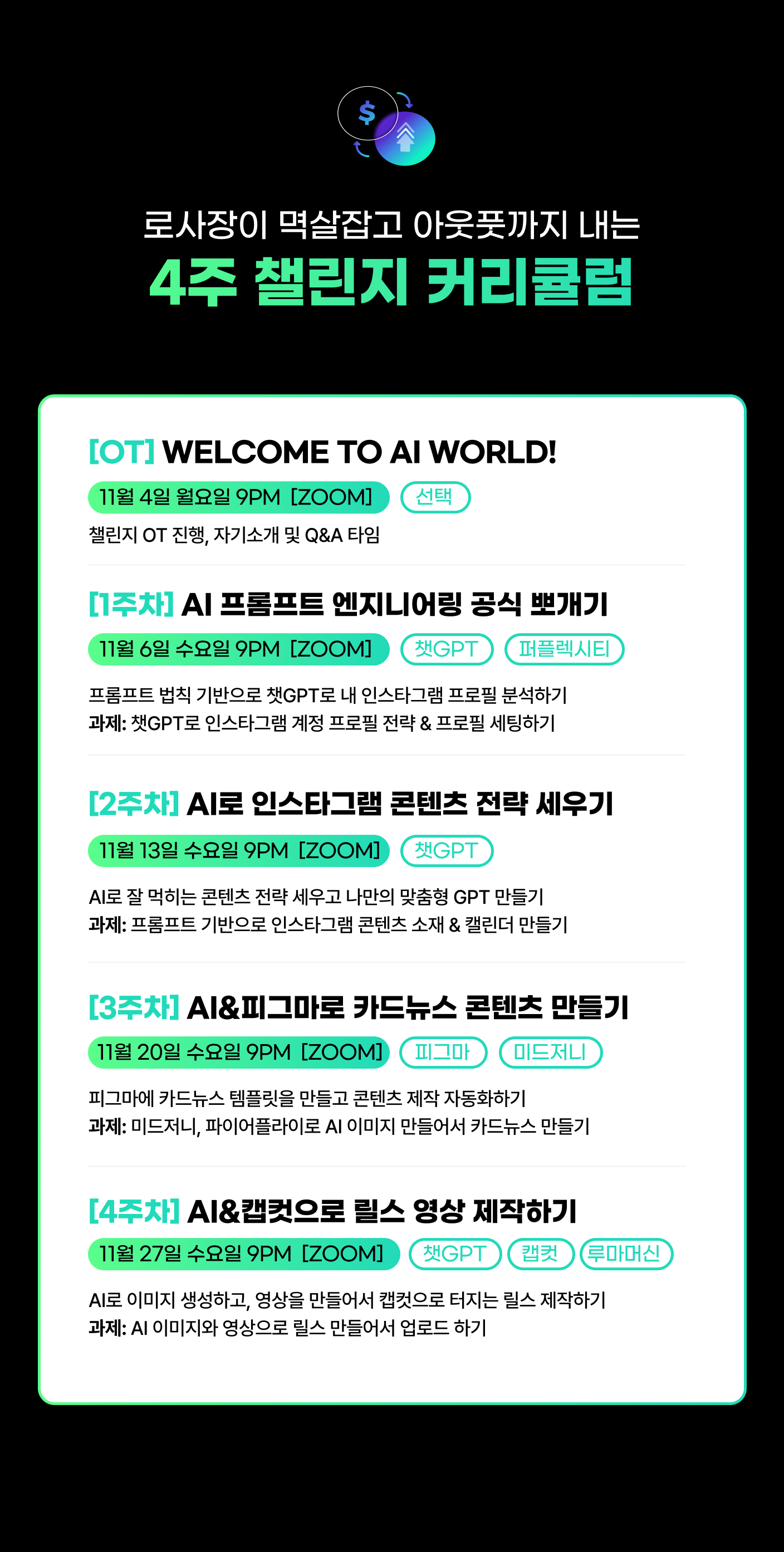 | 3주차 | AI&피그마로 카드뉴스 콘텐츠 만들기 | 11월 20일 (수) 저녁 9시 |