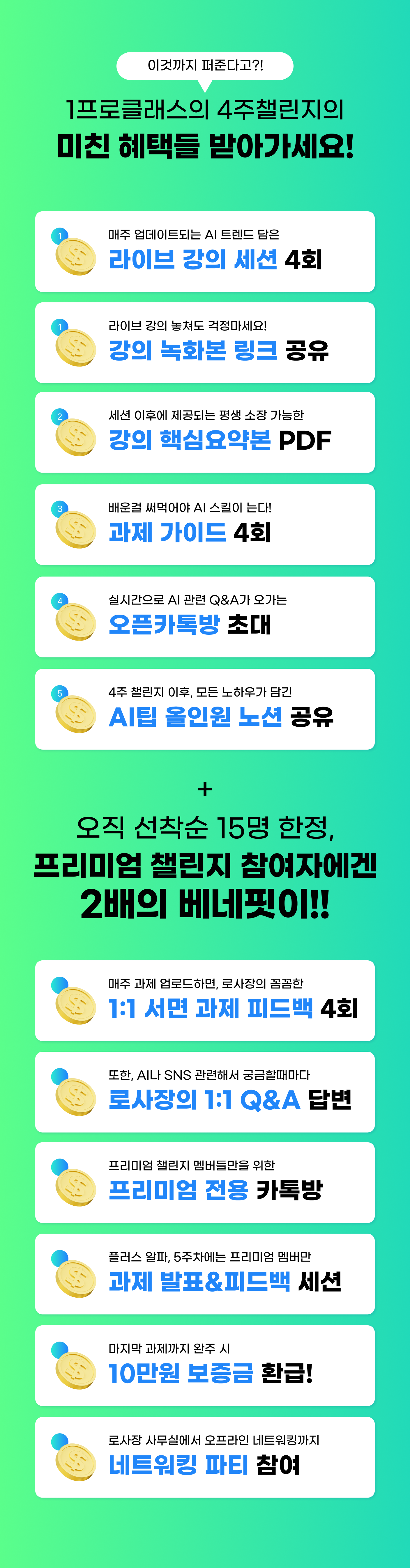 다만, 프리미엄 챌린지는 과제에 대한 1:1 서면 피드백이 제공되고, 마지막 5주차에 프리미엄 챌린지 분들과 별도의 줌 세션으로 로사장의 실시간 피드백이 주어집니다. 프리미엄은 과제 완주 시 10만원 환급금도 돌려드리고 있어요!]