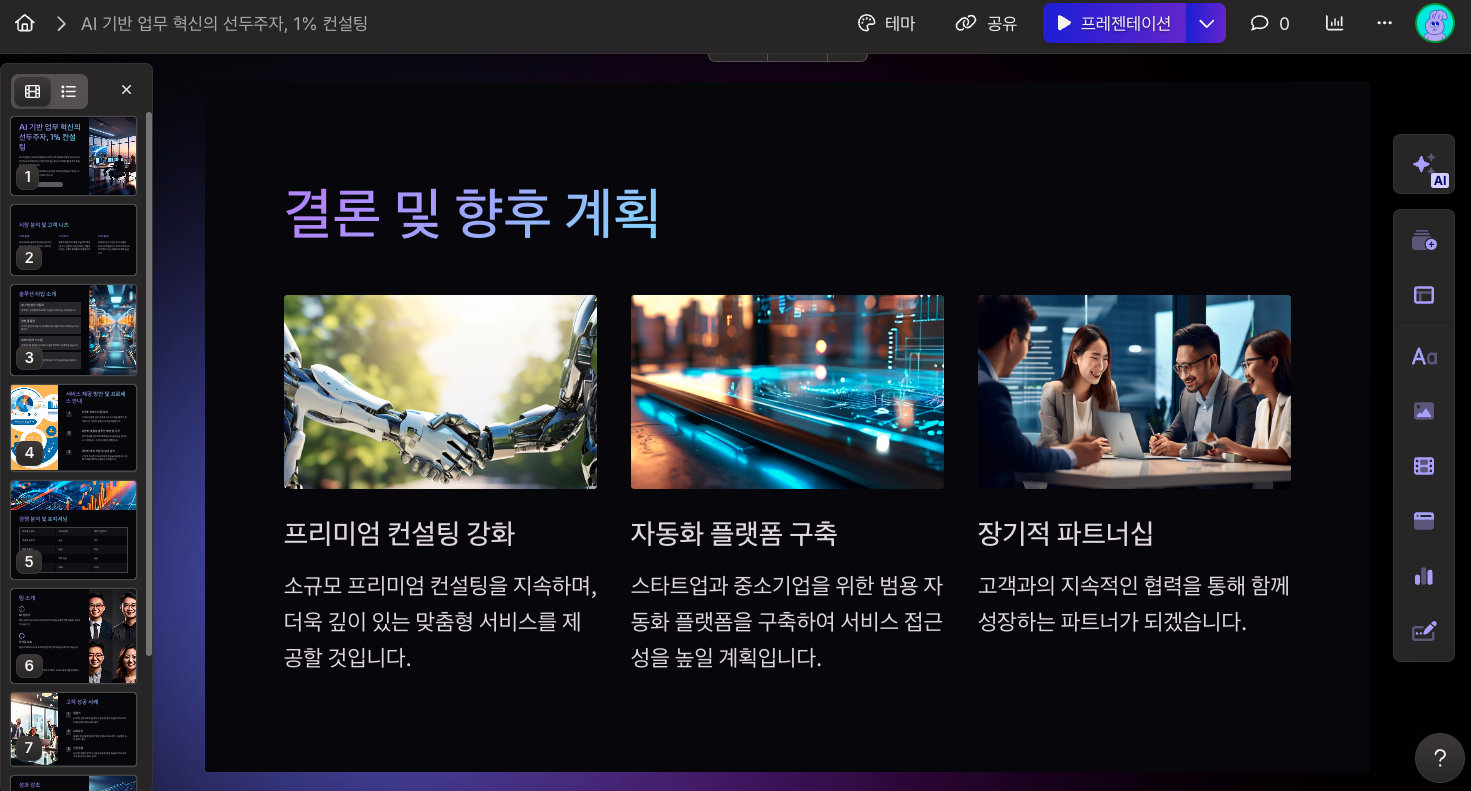 자동화된 템플릿을 제공하면서, 테마도 고를 수 있고, PPT 초안까지 AI가 알아서 써준답니다.