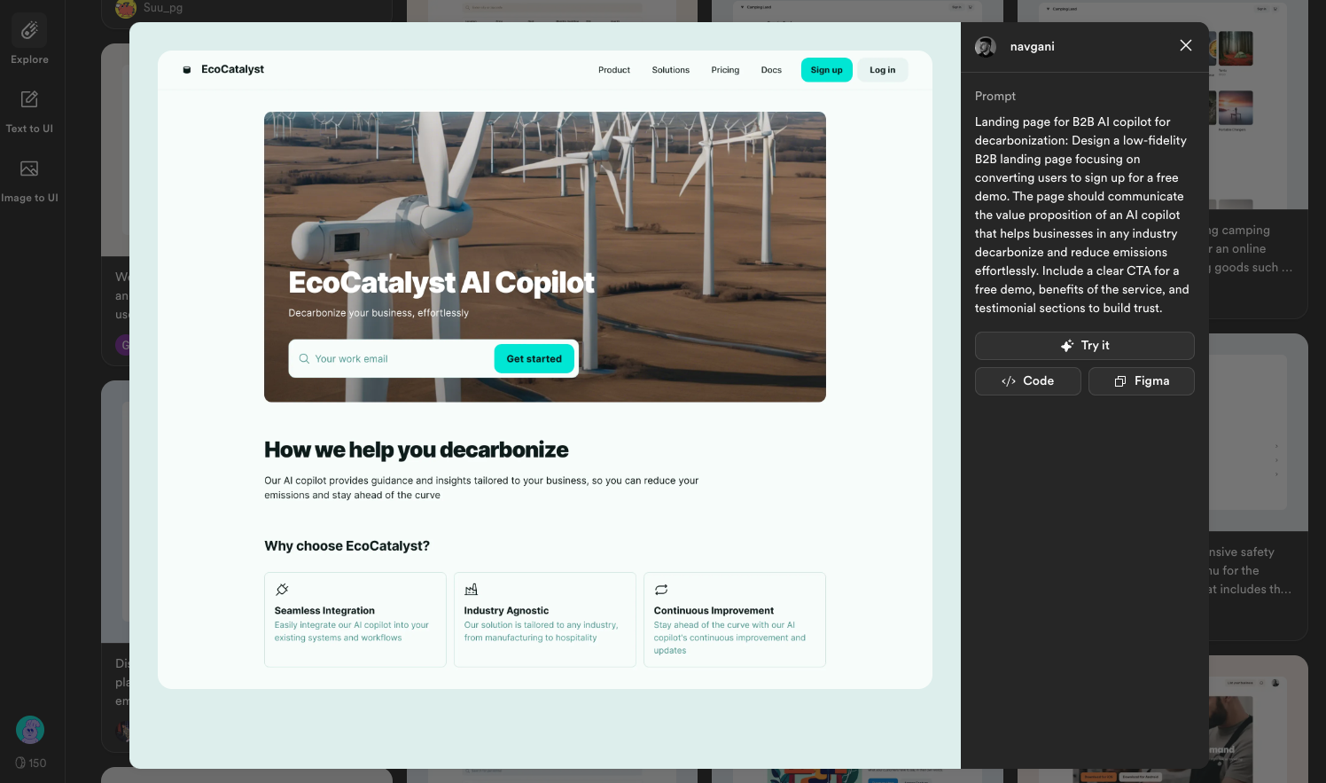다른 유저들이 어떤 프롬프트로 웹사이트 및 앱 디자인을 만들었는지도 볼 수가 있는데요.