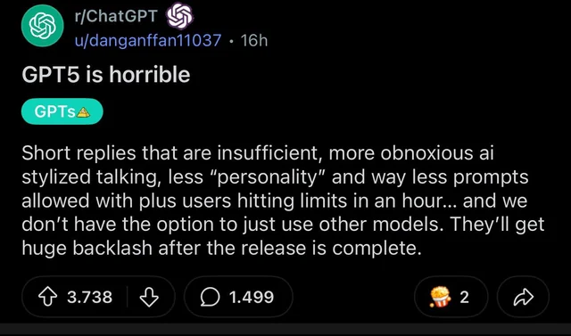 미국 최대 온라인 커뮤니티 레딧에는 “GPT-5는 끔찍하다(GPT5 is horrible)” 라는 제목의 게시글에 5000개가 넘는 불만 글이 쏟아졌어요 😢 이러한 비판들에 결국 ‘올트먼’은 전반적인 GPT-5의 사용자 경험을 개선하기 위한 수정 작업을 추가로 진행하기로 약속했다고 하네요!