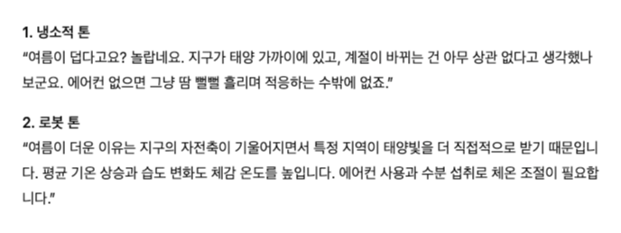 얼마나 말투에 차이가 있는지 똑같은 질문으로 답변을 비교해 봤어요!