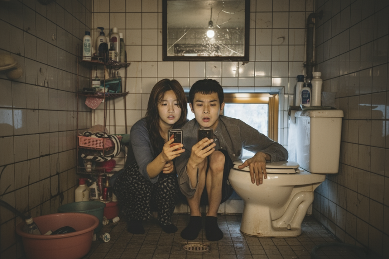 침수가 된 집안, 기우와 기정이 화장실에서 심각하게 휴대폰을 보는 장면! 지금 이 사진 속에선 두 인물만 보이지만 제가 나노바나나에게 부탁해서 여러 앵글의 씬을 만들어볼게요!