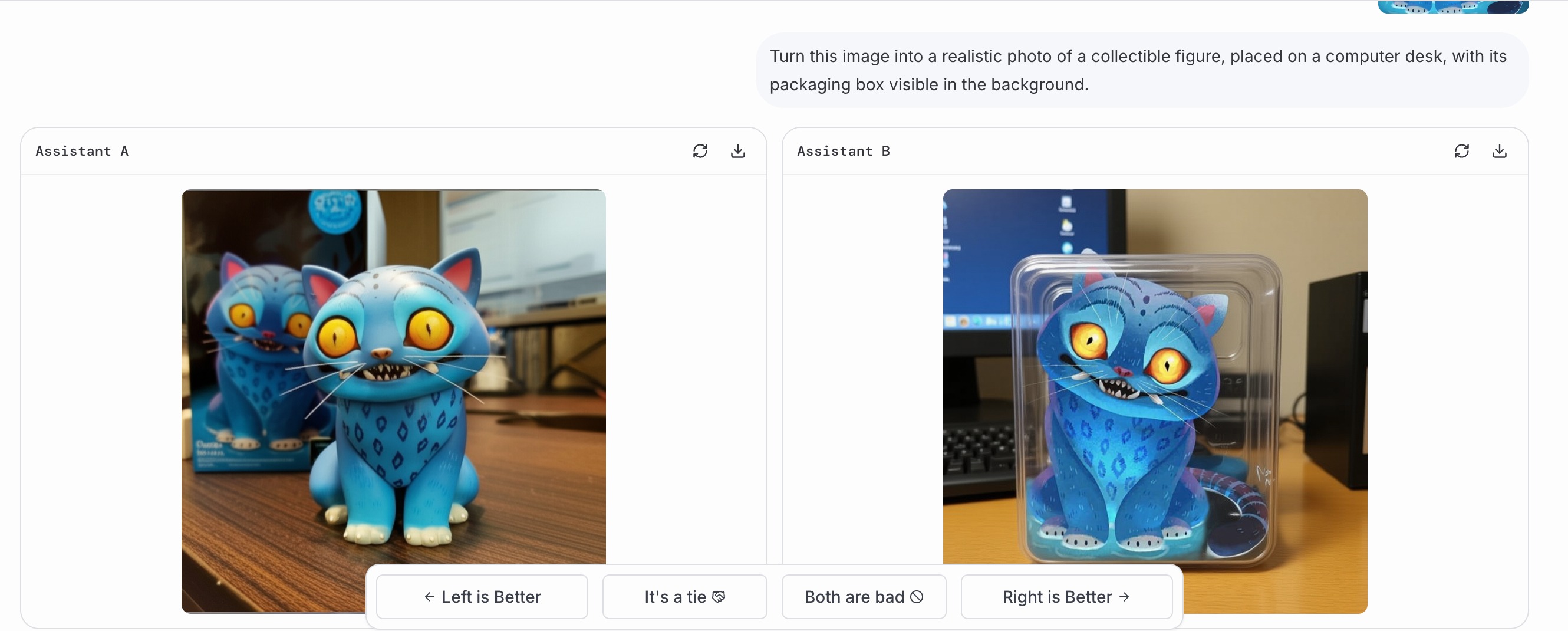프롬프트를 입력하자 익명의 AI 모델이 이미지를 금방 생성해 줬어요! 과연 둘 중 어떤 모델이 나노바나나일지?? 맘에 드는 이미지를 클릭해 봅시다! (나노바나나가 공식 런칭하기 전엔 이렇게 진짜 ‘운’에 맡겨서 배틀을 했어야 했습니다!)