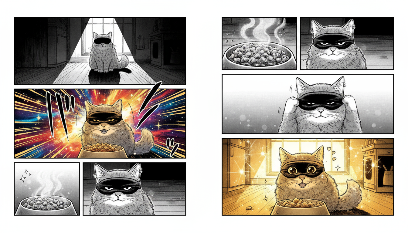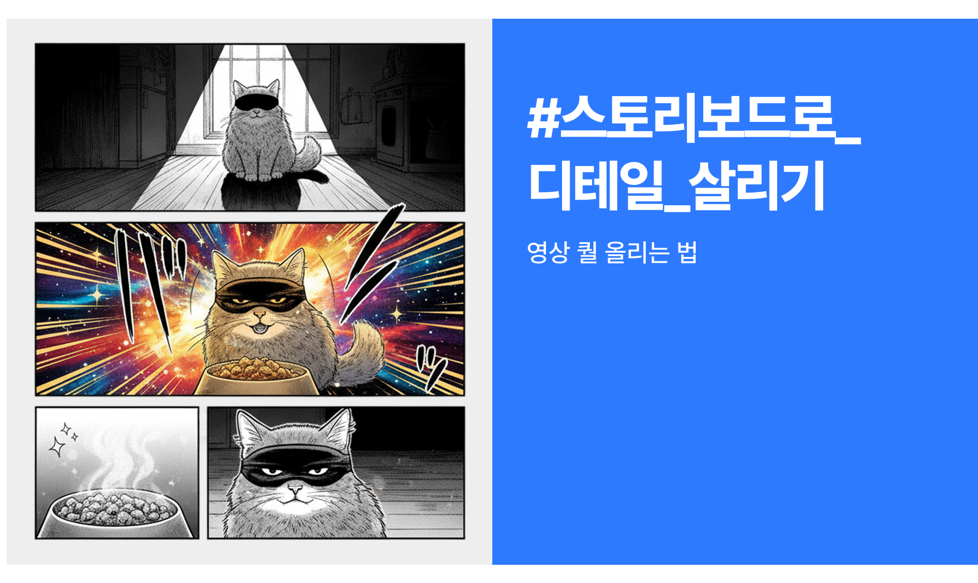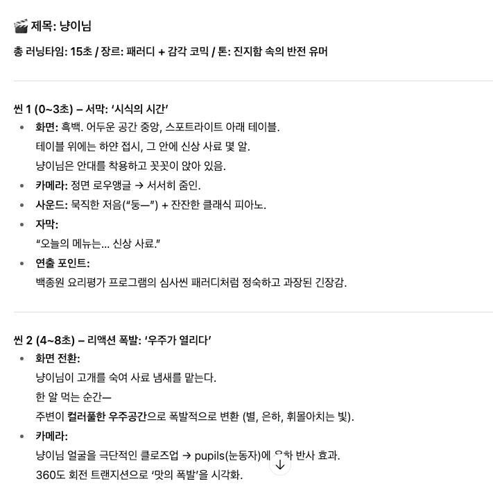 📝 "흑백 요리사 컨셉으로 고양이가 안대 끼고 사료를 먹는 느낌의 15초 분량의 재밌는 고양이 사료 광고 영상 씬별로 콘티를 만들어줘"