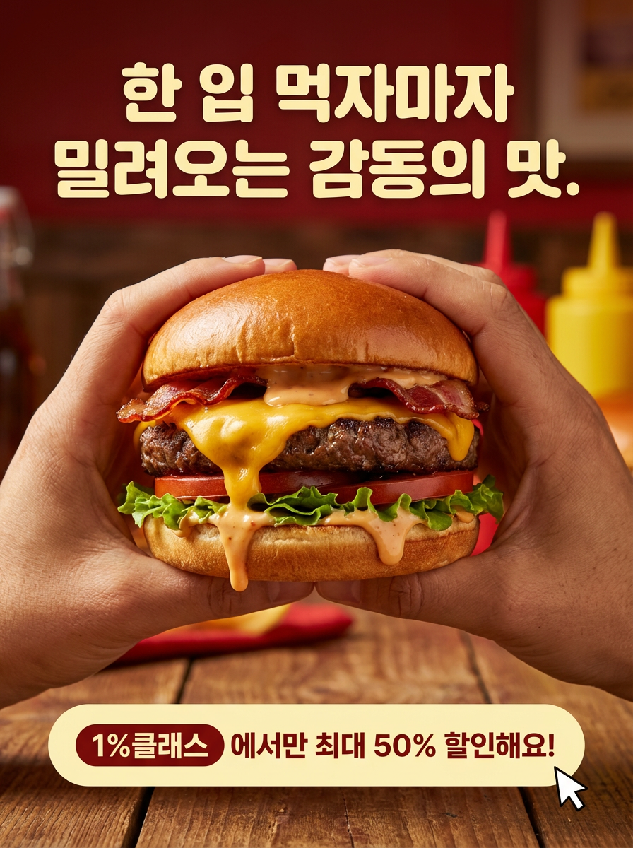 📝 "메타 광고를 위한 수제 치즈 햄버거 광고 소재 이미지를 제작할 예정이야. 첨부한 사진의 구도를 참고해서, 맛있는 햄버거와, 그걸 손으로 들고있는 사람의 손 사진을 포함하여 소재 이미지를 제작해주세요. 전반적인 톤은 빨간색과 연한 노란색.카피는 상단에 "한 입 먹자마자 밀려오는 감동의 맛." 하단에는 클릭을 유도하도록 "1%클래스 에서만 최대 50% 할인해요!" 로 써주세요."