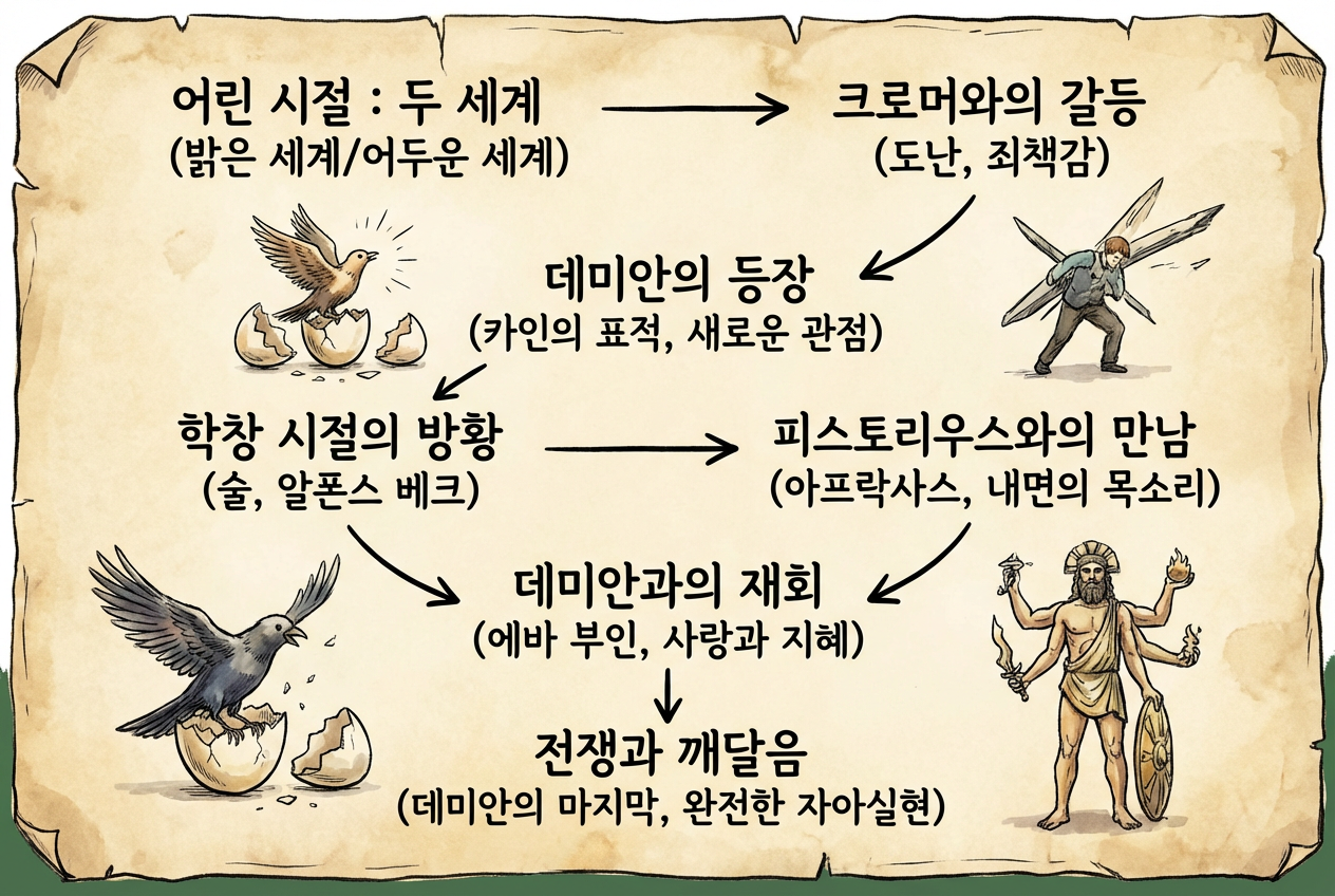 📝 "‘데미안’ 책 내용에 대한 플로우차트를 이미지로 만들어줘"