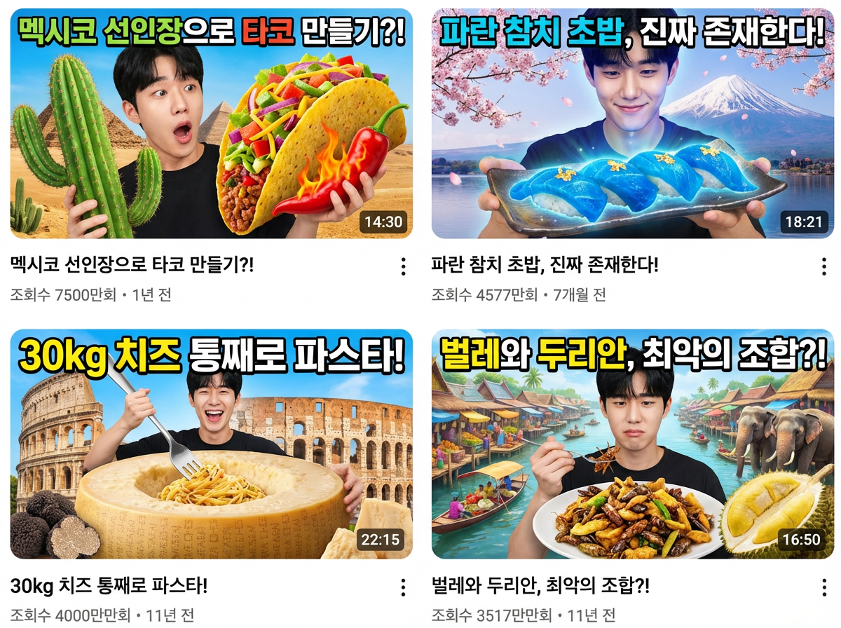 📝 "이런 종류의 유튜브 썸네일을 만들고 싶어. 이 사람이 주인공으로 나오게. 세계 각국 재료로 신기한 요리를한다.라는 주제로 썸네일을 4개 만들어줘"