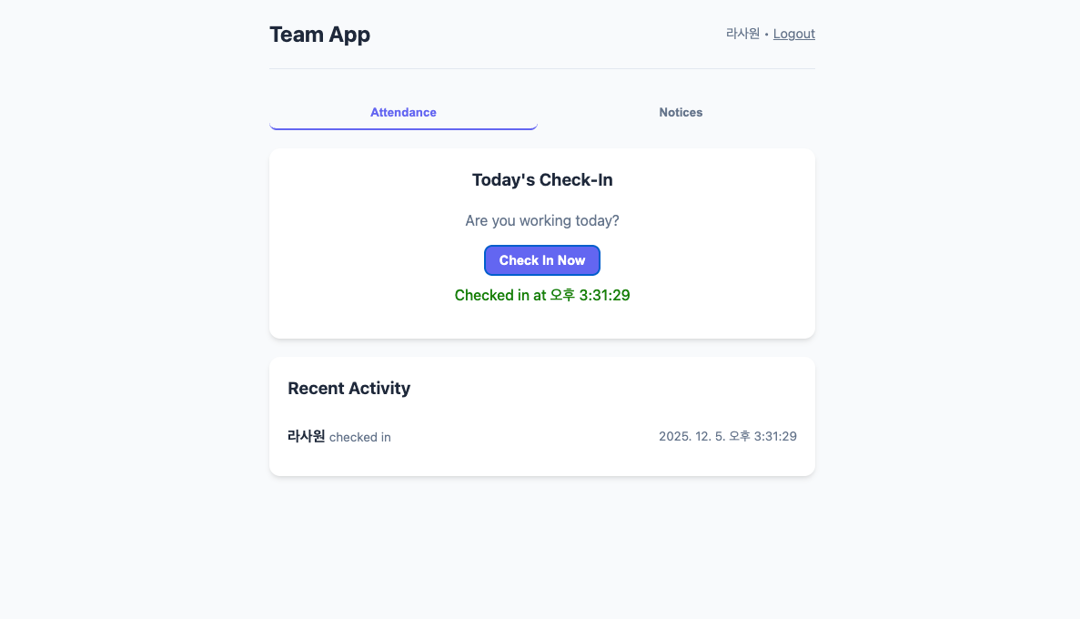 출석 체크 버튼을 누르면 시간까지 정확하게 기록되고, 팀원들과 소통할 수 있는 공지 게시판 기능까지 탑재!