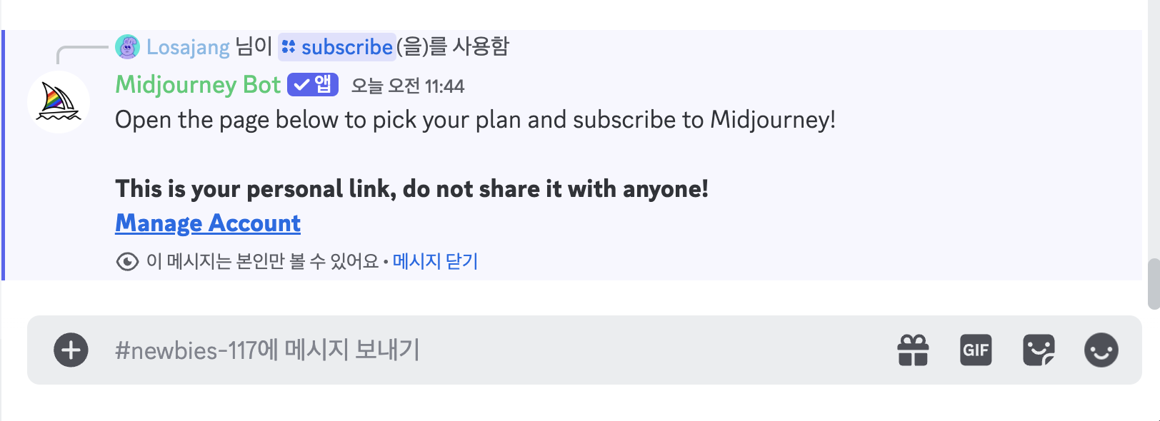 02. 그럼 나만 볼 수 있는 메시지로, 미드저니 봇이 구독 관련한 메시지를 보낼거예요.