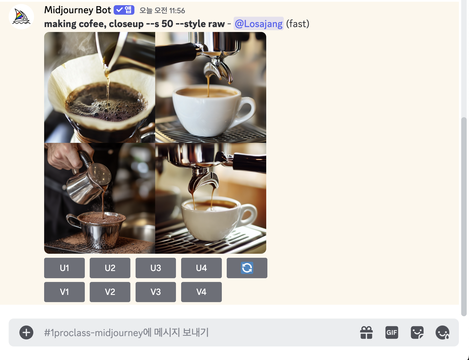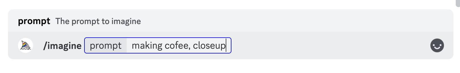 12. 우선, 미드저니 명령어는 '/imagine'만 기억하시면 됩니다! 이매진은 이미지를 생성하라는 명령어예요. 채팅창에 '/imagine'을 선택하면, 프롬프트를 입력할수 있는 칸이 뜨게됩니다. 그 뒤에 만들고 싶은 키워드를 영어로 입력하고 Enter를 쳐줄게요. 'making coffee, close up'이라고 입력해서 커피를 만드는 클로즈업 이미지를 만들어볼게요.