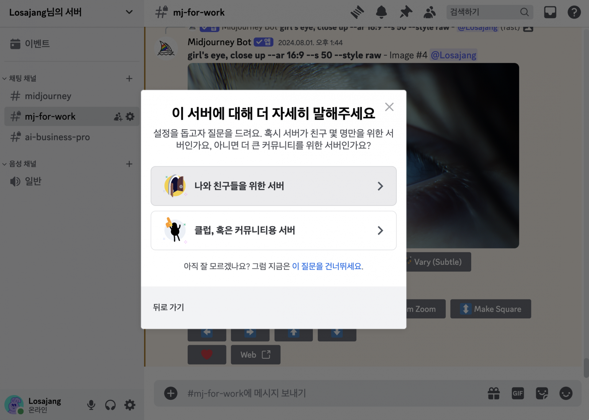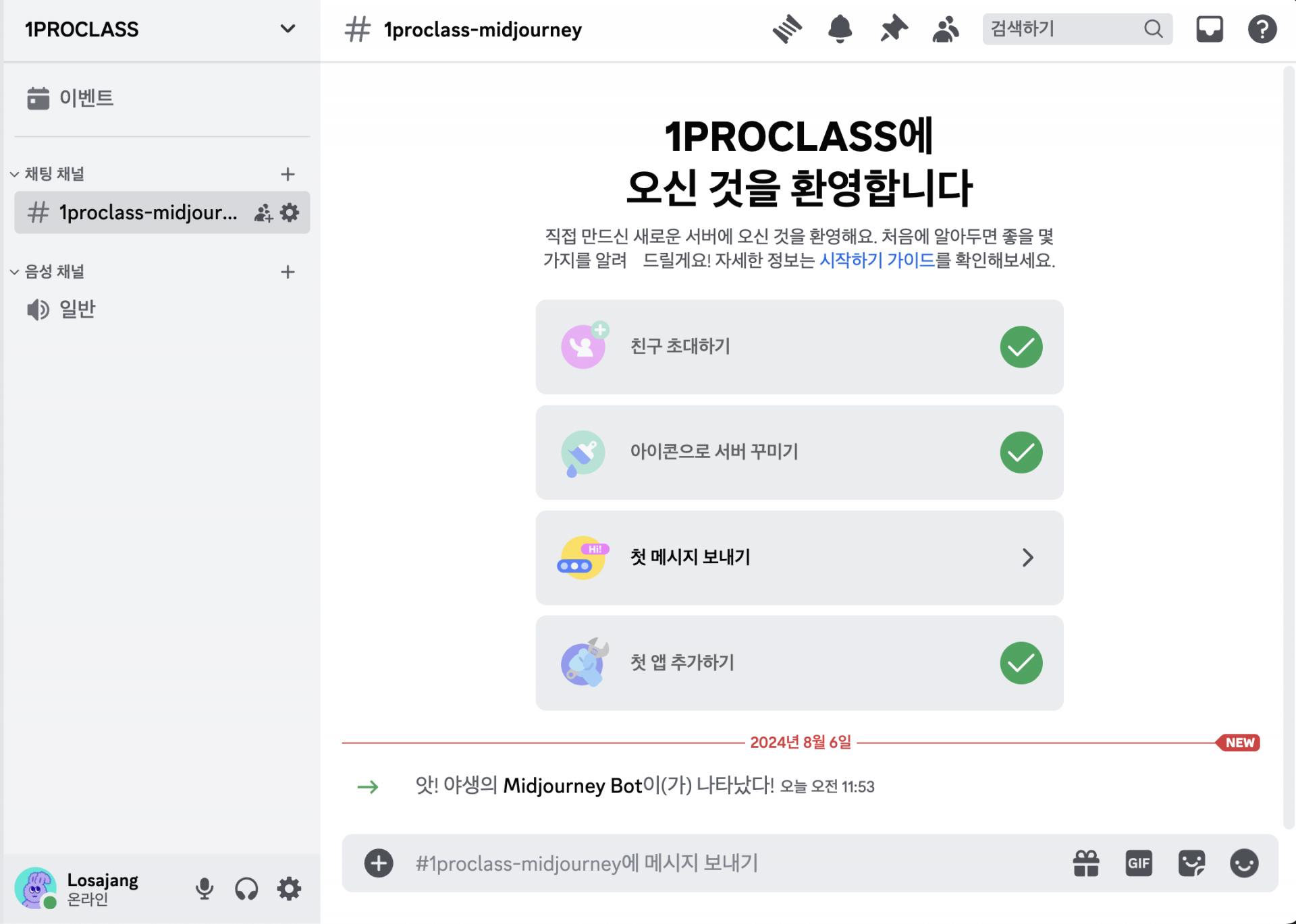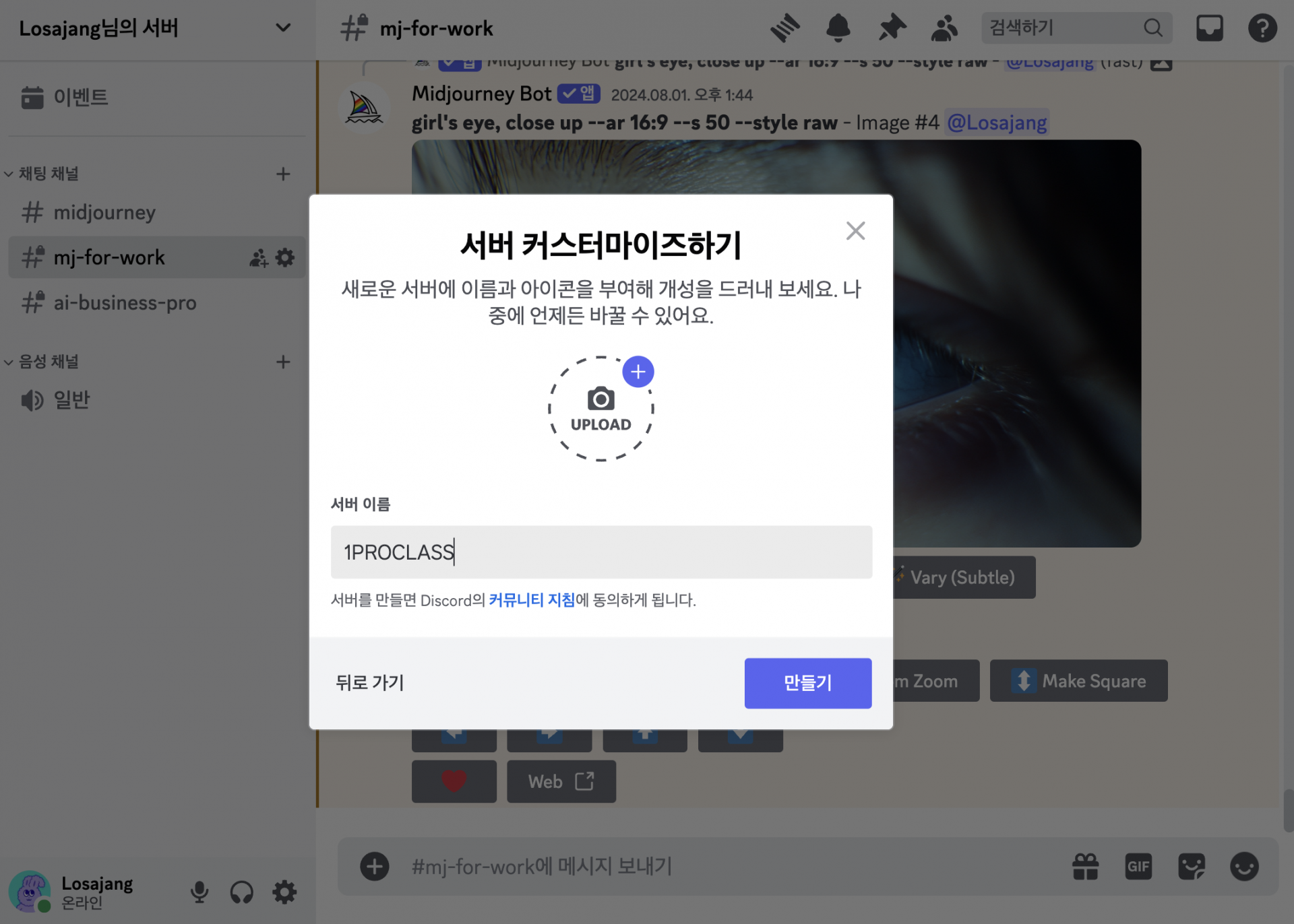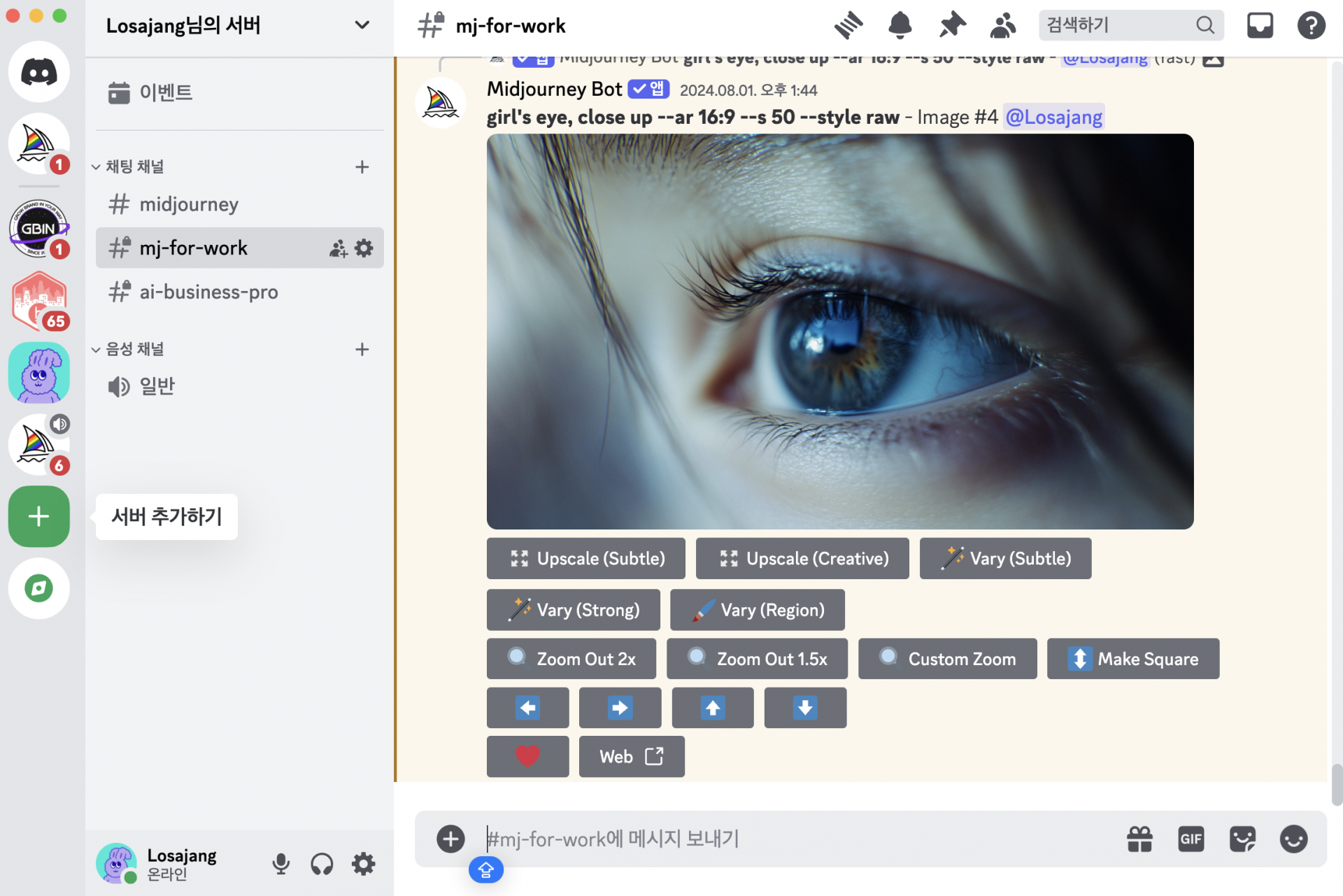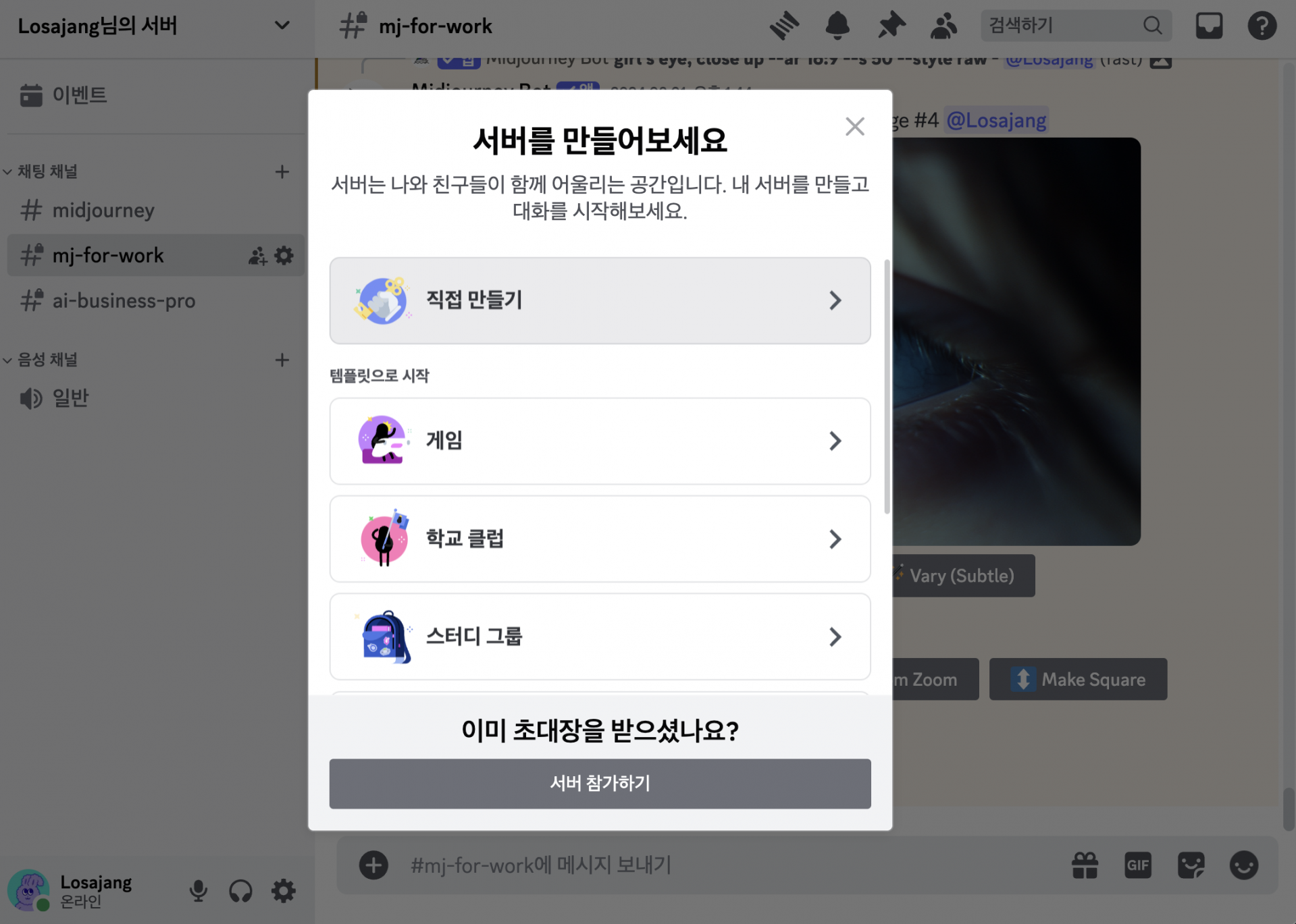 그래서 아예 디스코드에서 내 프라이빗 채널을 만들어서 미드저니 봇을 불러와볼게요.