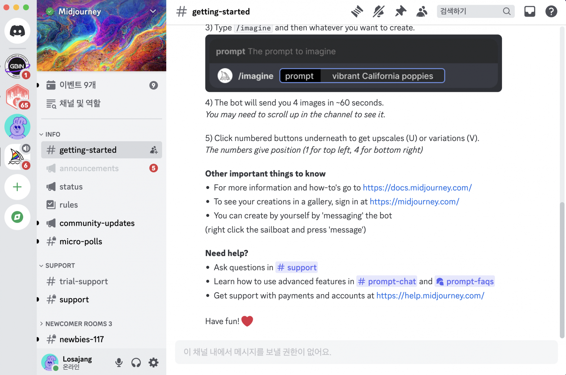 05. 디스코드에서 '미드저니' 채널이 열리며, #getting-started 와 관련한 웰컴 메시지가 뜹니다.