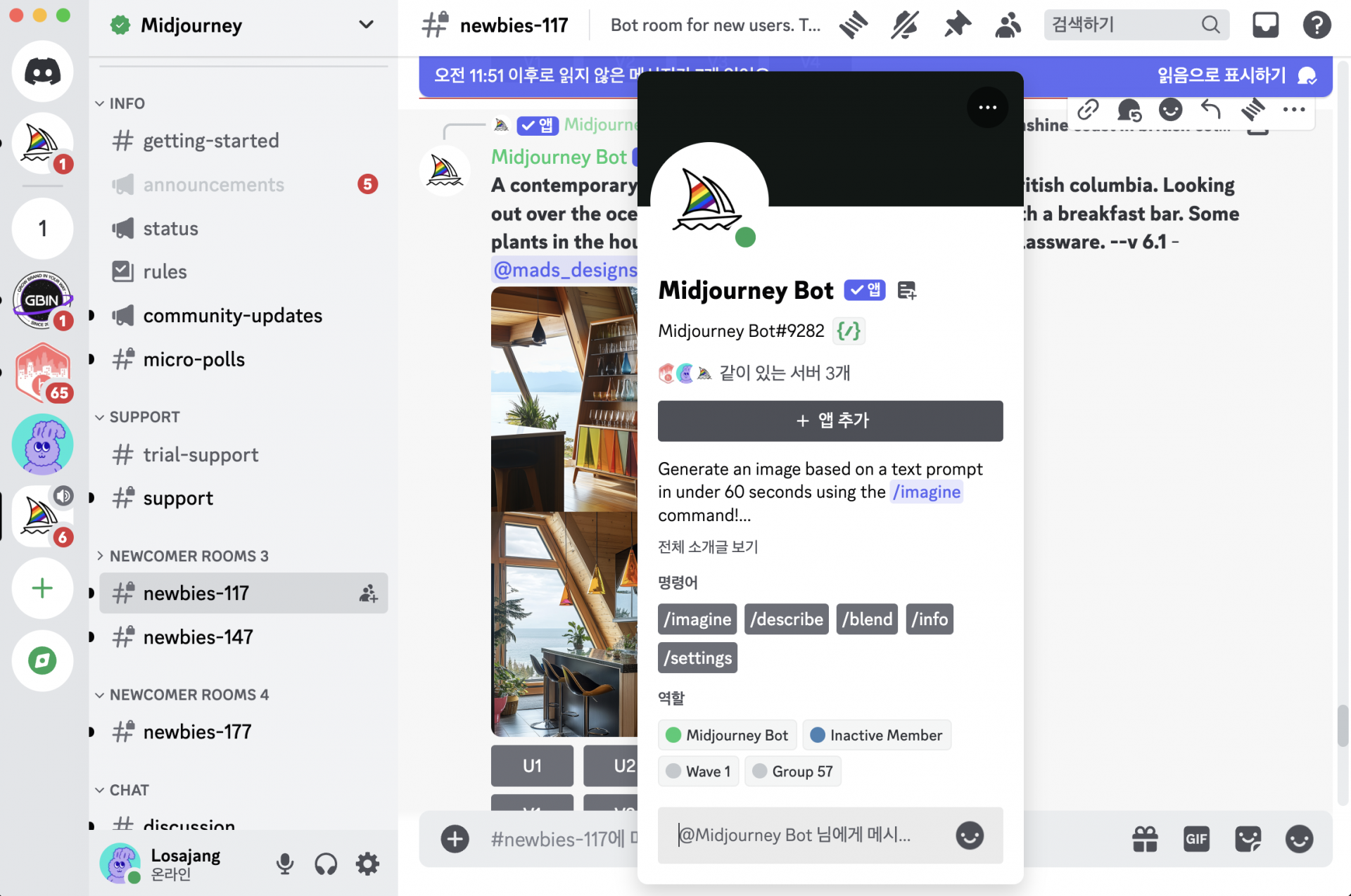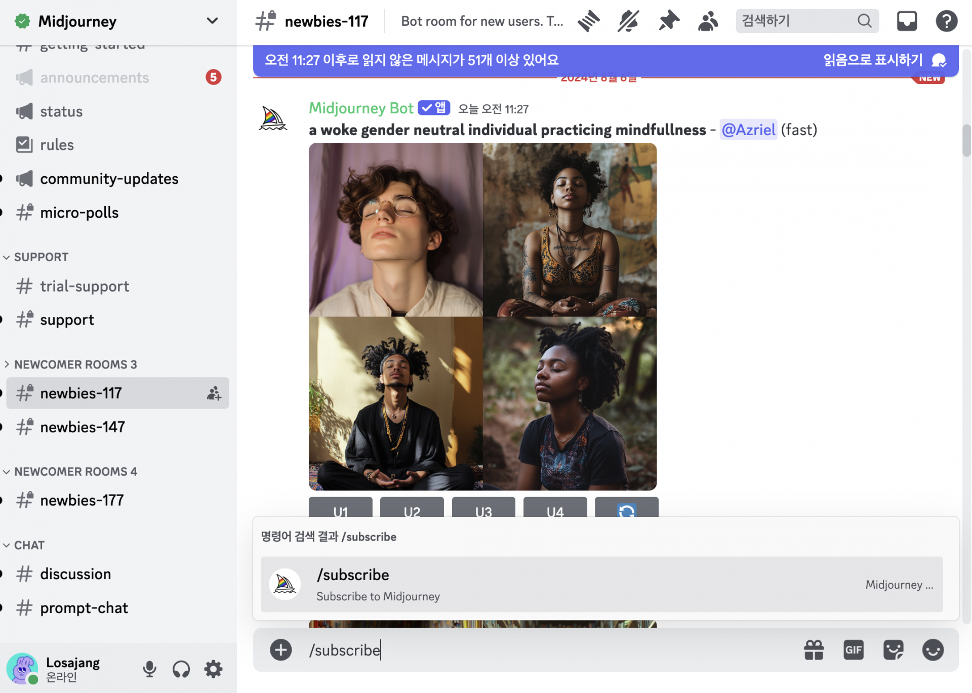 특이하게 디스코드는 커뮤니티 기반이라, 다른 사용자들이 어떤 이미지를 생성하는지 뉴비 룸에서 볼 수 있습니다.