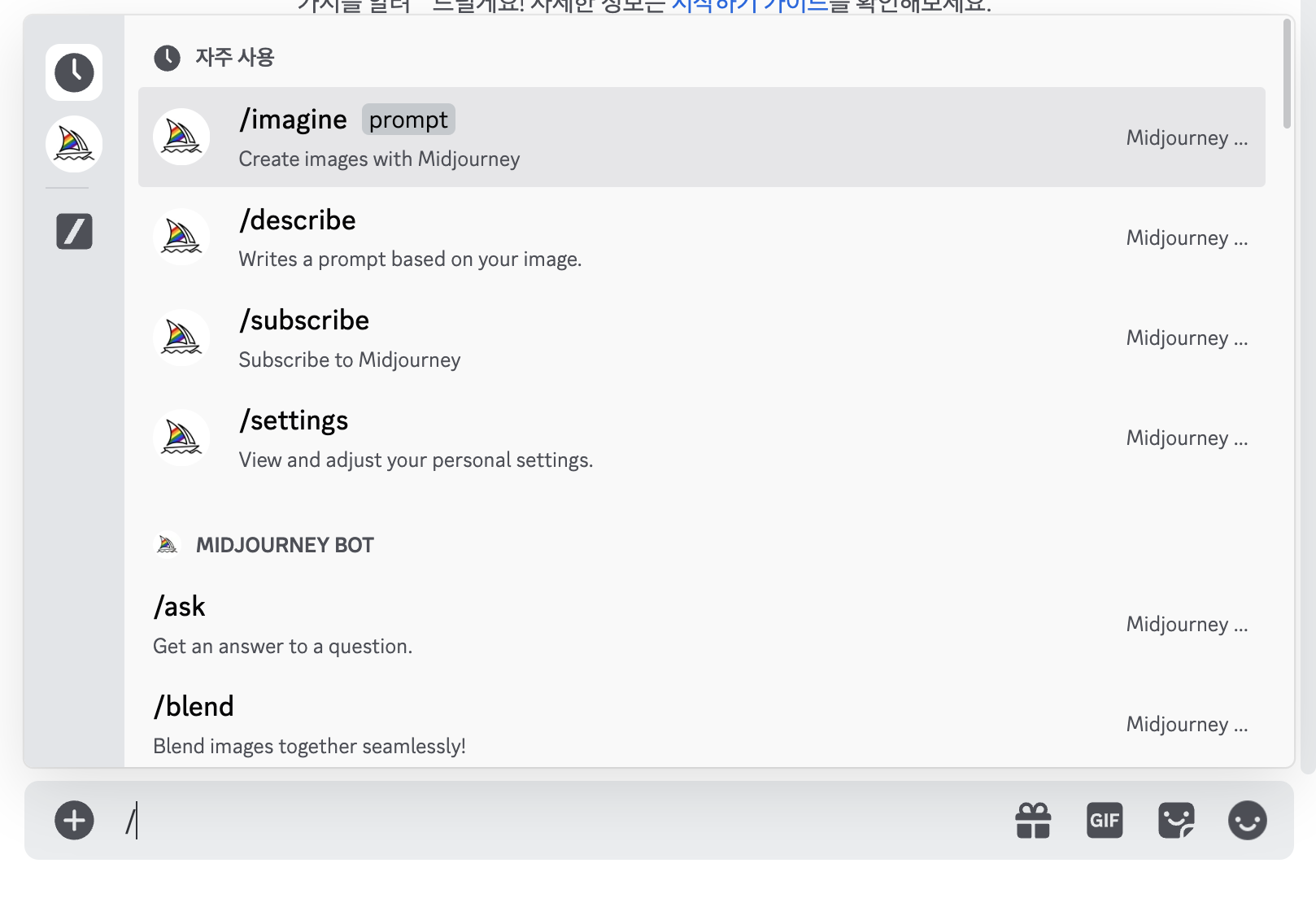 11. 채팅창에 '/(슬래시)'를 입력하면, 미드저니봇에게 시킬수있는 다양한 명령어가 뜹니다.